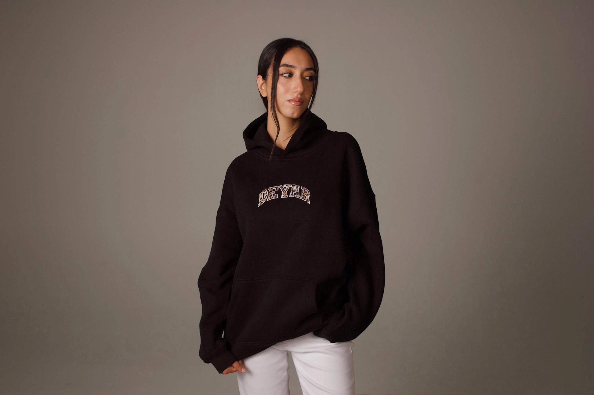 Our premiere, cozy, pullover hoodie in black. 500 GSM, 100% cotton material. Embroidered cheetah-print text on front and screen-printed grey design on back.
